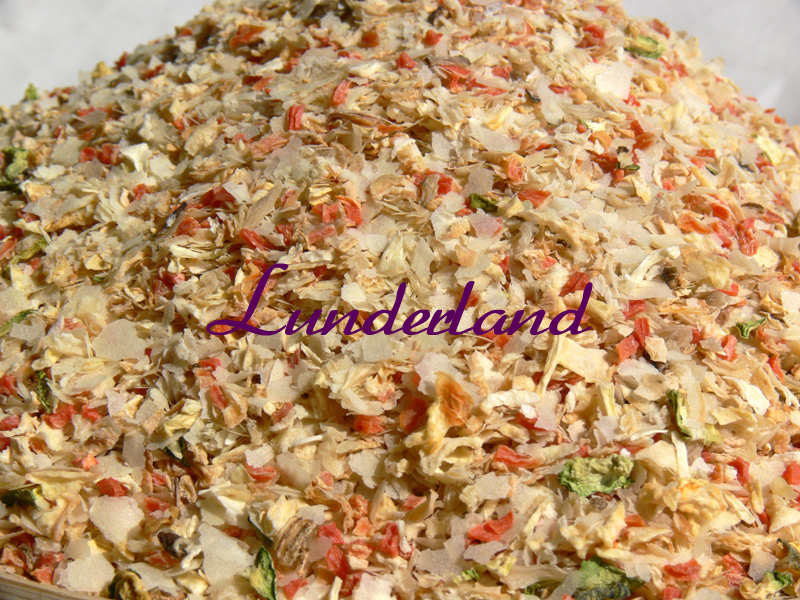 Ein getreidefreier Mixer zur Fleischfütterung. Zusammensetzung: Kartoffel, Pastinake, Gehaltsrübe, Mohrrübe, Steckrübe, Zucchini, Kürbis, Sellerie Hinweis zur Handhabung: Mischen Sie die Flocken mit dem selben Volumenanteil Wasser (z. B. 1/2 Tasse Flocke mit warmen bis heißem Wasser aufgießen) und lassen Sie die Flocken 15 bis 30 Minuten einweichen. Um die Verdaulichkeit zu erhöhen besteht die Möglichkeit, die feuchten Flocken zu pürieren. |