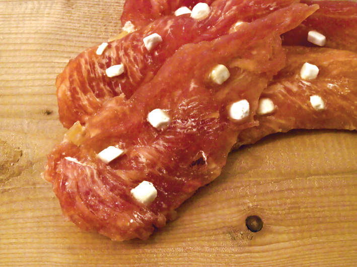 Belohnen Sie iHren Hund zur Abwechslung einmal mit diesem besonderen Gourmet-Snack, einer ausgefallenen Kombination aus Hühnerbrustfilet und Käse. |